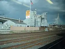 Boston Sand & Gravel, as seen from an MBTA Commuter Rail train, with the cable-stayed Zakim Bridge in the background.