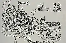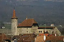 During the Middle Ages it was the capital of the seigneurie of Boudry. Until the 14th Century, the hamlets of Pontareuse and Vermondins were part of the seigneurie. Pontareuse was near the bridge, with which the Roman road of Vy d'Etraz crossed the Areuse, while Vermondins was on a plateau near the modern city of Boudry. In 1282, Pierre de Vaumarcus sold the jurisdiction rights to Girard d'Estavayer. In 1313, his son Rollin sold these rights to count Rudolph IV of Neuchâtel. Two years before, Rudolph IV had seized the Bailiwick of Areuse from Pierre d'Estavayer. Boudry Castle was probably built before 1278 by the Counts of Neuchâtel. So the purchase in 1313 united both of these lands together with the castle lands under the Counts of Neuchâtel.[3]