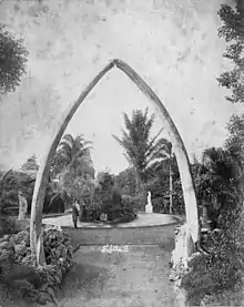 In August 1872, an 84-foot (26 m) long black whale was found stranded on Woody Island in Hervey Bay. It was the largest whale ever seen in the area. Although the original plan was to tow the whale carcass to Maryborough to extract the whale oil, it was decided that extract the oil from the whale at Woody Island and the ship Effie set forth from Maryborough with men and barrels for the job. The boiling-down of the whale yielded 1,500 imperial gallons (6,800 L; 1,800 US gal) of oil. The Queensland Government requested that the skeleton be preserved to be kept as a scientific specimen.[4][5][6] Some of the whale bones were donated to the acclimatization society in January 1887.[7] The jawbones were used to create a archway for the entrance to Bowen Park; it was 22 feet (6.7 m) high.[8][9]