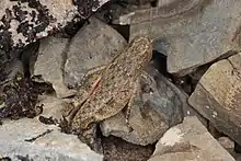Brachaspis nivalis is polymorphic and has cryptic coloration resembling the surrounding rocky habitat. The color morphs can be either grey or grey mottled brown.[6] Individuals with scarlet, purple or indigo-black flash-display of the hind legs have been collected at various sites (unlike the reddish brown hind legs in B. collinus).[5] Males are usually smaller than females. The known body length of males range between 15-24 mm, and the females between 16-40 mm.[6] The length of the hind femur of males are 8.5-12.5 mm, and the females are 11.5-17 mm.[3] Generally, the body size of B. nivalis is smaller than B. robustus.[8] Body size of adult B. nivalis increases with elevation, the largest individuals are found above 1200m asl and the smallest on stream edges at low elevation.[4]