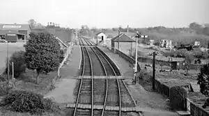 The Buckinghamshire Railway's station was built at the southern end of the main high street and was constructed of a yellow-grey coloured stone.[6] A single loop was enclosed between two-facing platforms, each of a height of 32 inches (0.8 m). A water tower for locomotives was positioned on the roof of a stone shelter situated on the up platform, slowly refilling from a nearby spring. The station's goods shed was built at a right angle to the line where a wagon turntable enabled vehicles to roll into the shed, aided by a slight gradient. A short spur on a severe gradient served the Hopkins and Norris brewery; horses drew the wagons up the gradient to allow them to be returned to the station yard by gravity. The spur (known locally as the "barrel line") fell into disuse in the early 1920s and the rails were lifted by 1935.[7] The station's goods yard was not large, but was capable of accommodating the daily 3 to 12 wagons destined for the gasworks and the 4 to 5 wagons of malt and sugar for the brewery. A cattle dock could take four vans, and a 5-ton capacity crane was stationed in the yard.[8]