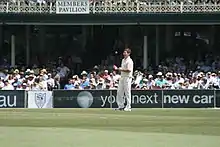Hogg was recalled to the Australian Test team to tour the West Indies in April 2003, where he played two matches. The gap of 78 games between his Test appearances is the longest such run for an Australian.[13] He also played against Zimbabwe at the SCG later that year, but was upstaged by part-time slow left-arm wrist-spin Simon Katich, who took 6/90 for the match (Hogg took 3/119). He was left out of the Test team in 2004 but remained in the national one day team as the preferred spinner to Stuart MacGill. In 2005–06, he became a one-day only player with Western Australian selectors preferring to play young spinner Beau Casson ahead of Hogg in the state's Pura Cup side. However, with Casson's move to New South Wales in 2006–07, Hogg regained his place in the first-class side. In 2007–08, after a four-year layoff, Hogg was recalled to Test cricket to play against India after Stuart MacGill had to withdraw from the team due to suffering from carpal tunnel syndrome in his bowling hand.[14] On 2 January 2008, Hogg scored a Test-career-best 79 as part of a 173-run partnership with Andrew Symonds—a 7th wicket record for both the Sydney Cricket Ground and Australia vs. India.[15]