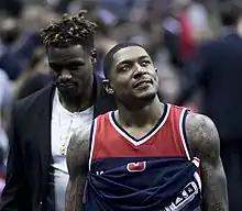 On July 26, 2016, Beal re-signed with the Wizards.[24] On November 19, 2016, he scored 34 points in a 114–111 loss to the Miami Heat.[25] Two days later, he had 30 or more in consecutive games for the first time in his five-year career, recording a then career-high 42 points in a 106–101 win over the Phoenix Suns.[26] On November 27, he was fined $15,000 for grabbing at the throat of Evan Fournier during the Wizards' game against the Orlando Magic two days earlier.[27][28] On November 28, he scored 31 points and hit a career-high seven three-pointers in a 101–95 overtime win over the Sacramento Kings.[29]
