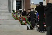 Veteran placing a poppy at the Brampton cenotaph in Ken Whillans Square
