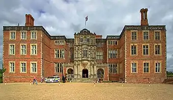 In March 1605,[12] Edward la Zouche, 11th Baron Zouche, a favourite of James I,[13] bought the property from Thornhurst. A house was earlier planned on the site for Henry Frederick, Prince of Wales (1594–1612),[13] whose heraldic feathers are displayed above the central pediment.[14] Lord Zouche demolished a large part of the building and began to build the Bramshill House of today. Henry Shaw describes the new house which Zouche built as a "specimen of Elizabethan [sic] architecture [which] merits particular attention, exhibiting all the stateliness for which the period referred to was remarkable, with a suite of apartments both large and lofty. The amplitude of its dimensions indicate a princely residence."[15]