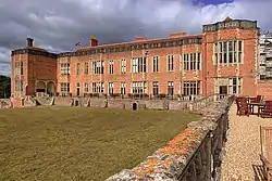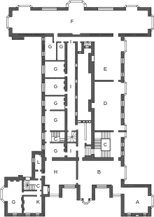 The building stands on the edge of a plateau, overlooking the park to the south.[45] The plan of the house is unusual, partly because of its incorporation of the earlier building; it extends at right angles to the primary (southern) façade.[43] The elevations are symmetrical, facing outwards, but the interior court is narrow, and projecting wings lie at either end of the eastern and western sides.[28]