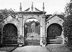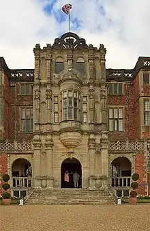The north façade has three bays separated by windows and features a loggia, typical of early 17th-century houses, with a central arched entrance to accommodate coaches.[43] The central bay is crowned by an ornamental pierced parapet below a niched Dutch gable, which shelters a small statue of Lord Zouche[43][46] or James I.[47] There are small obelisks at either side of the gable.[28] Thorpe originally intended the main entrance of the house to be on this side, building on the gatehouse of the earlier Foxley house.[48]