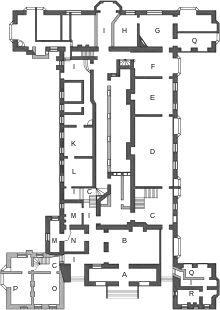 The Long Gallery fills the first floor of the northern range: 126.5 feet (38.6 m) long and with a richly decorated stucco ceiling and a complex wooden chimneypiece,[71] it formerly contained a "very curious collection of portraits of distinguished characters".[15][72]