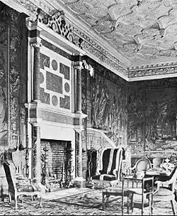 Beyond the staircase are the state rooms[69] and what was known as the "Wrought Room".[59] The room has an ornamental ceiling with a Renaissance chimneypiece.[59] Two of the bedrooms, the two "White Rooms", were originally connected to what was called the Flower-de-luce Room, but the doors have been boarded up.[70]