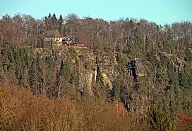 Brand (Sächsische Schweiz) is a mountain in the Saxon Switzerland, southeastern Germany. It is located above the river Polenz and offers one of the most famous view points of the region. Its name (German for fire) refers to the wildfires that occurred in the surrounding forests.