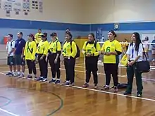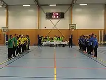 Brazil and Greece women's goalball teams line-up at the start of the first half. Goalball World Championships, Malmö, Sweden (June 2018).