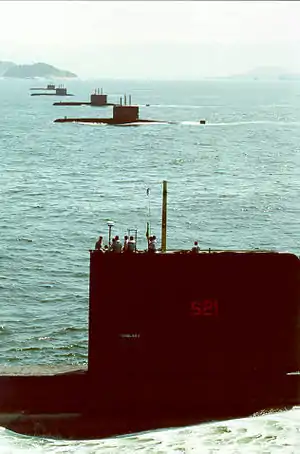 The submarine, built by Vickers Shipbuilding and Engineering at their shipyard in Barrow, was laid down on 18 November 1971, and launched on 22 November 1972.[1] During construction, a fire seriously damaged the submarine.[1] The submarine was towed to Chatham Dockyard, where the 60-foot (18 m) central section was cut out and replaced.[1] The fire was found to have originated in the cabling, and prompted the recabling of all under-construction Oberons.[2] She was commissioned into the Brazilian Navy on 10 December 1977.[2]