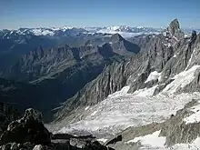 Brenva Glacier with Aiguille Noire de Peuterey (right). Viewed from the Tour Ronde, July 2011.