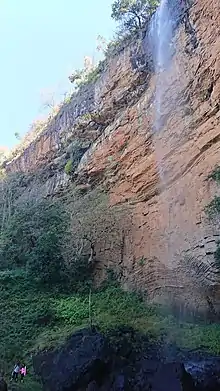 The Bridal Veil Falls is six kilometres outside Sabie, Mpumalanga in South Africa. It is 70 metres high. The falls is slow flowing under normal conditions making it appear like a veil, hence its name.[1] It is one of many waterfalls in the area that is located on the Sabie River and is a popular tourist destination. It is accessible by car, with parking and a picnic area on SAFCOL's grounds. Local curio dealers sell arts and crafts from the car park area. From the car park, a footpath runs through indigenous forest for about 750 metres (15 minutes' walk) directly to the waterfall.[2]