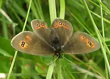 E. oeme Hbn. (35 g). Variable in size, usually somewhat smaller than medusa, the wings more elongate. On the forewing there is near the apex a russet -yellow, sometimes divided spot which bears two white-centred black ocelli. The hindwing has distally 2-4 white-centred ocelli which are edged with russet -yellow. Underside grey-brown, markings as above. The female, which is usually somewhat larger, is lighter, the ocelli being larger and more prominent than in the male ; the hindwing beneath yellowish grey. Widely distributed over the Alps, but sporadic, occurring especially on limestone, being usually not rare on the flight-places. — ab. lugens Stgr. is a smaller form in which the forewing is uniformly black-brown above ; on the underside the ocelli below the costa are always separated. In the Gadmen Valley in Western Switzerland. — spodia Stgr. (35 g) is mostly somewhat larger than oeme, the fore- and hindwings have a complete distal band, the ocelli are larger and conspicuously centred with white. Transitions towards nametypical oeme are not rare. This is the form of the Eastern Alps and the Balcan. — Egg (of the form spodia) round, glabrous, glossy white. Larva similar to the larva of medusa in shape and markings, not being green however, but pale clayish, with brownish longitudinal lines; each ring is crossed by a transverse line composed of 4 black united spots; above the legs a chocolate-brown side-stripe. On Luzula-species. Pupa pale yellow, the sheaths of the eyes, tongue and wings edged with brown (Rogenhofer). The butterfly in June and July.[2]