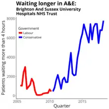 A Care Quality Commission report in 2014, said that accident and emergency services at Royal Sussex County Hospital were inadequate for responsiveness, suffered significant pressures and lacked sufficient physical space to deal with the number of patients that attended.[12] The trust was one of 26 responsible for half of the national growth in patients waiting more than four hours in accident and emergency over the 2014/15 winter.[13]