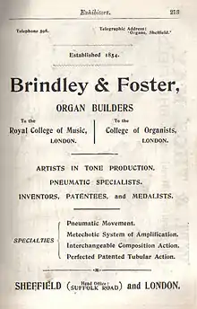 Brindley & Foster was a pipe organ builder based in Sheffield who flourished between 1854 and 1939.[1]