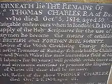 Gravestone in Wales of Thomas Charles, who helped found the BFBS