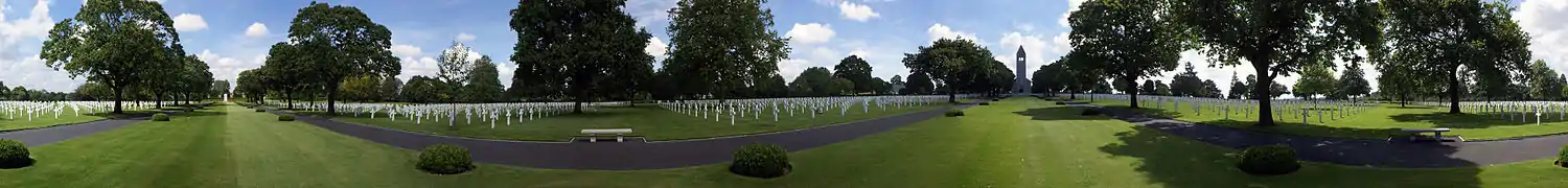 The Brittany American Cemetery, 28 acres (11 ha) in extent, lies among the hedgerows in rolling farm country in Normandy near the border with Brittany in France. It is one of fourteen permanent American World War II military cemetery memorials erected by the American Battle Monuments Commission on foreign soil.