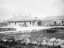 The railroad became the Old Colony and Newport Railroad in 1863, and finally the Old Colony Railroad in 1872.[6] A new Victorian-style station was built in 1873–74 at Church Street on the west side of the tracks.[12][13][14] The town was renamed Brockton in 1874, with the railroad station changing its name on May 7.[5][15] The railroad was a key part of the town's burgeoning shoe industry and rapid growth, which caused Brockton's population to double from 1877 to 1887.[16] A new freight house was built in 1881.[17]
