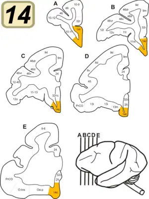 ![]() Prefrontal cortex of Sapajus. BA14 is shown in orange through some coronal sections. | |