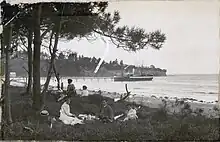 Picnickers at Browns Bay in the 1910s, with the Browns Bay Wharf and the SS Taniwha