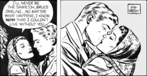 The strip's most obvious precursor was Milton Caniff's Terry and the Pirates, which had taken on a strong aviation slant a few years earlier, when its protagonist joined the U.S. Air Force. And there was good reason for the resemblance. Tho he'd been a sports cartoonist, comic book artist and animator (he worked on Fleischer's Betty Boop and Popeye cartoons), Bailey's best known earlier work was as Caniff's assistant on Terry and Male Call. His drawing style was strongly reminiscent of Caniff, as was his method of putting together stories. Bruce Gentry was a well-done strip because Ray Bailey had learned from one of the best in the business. The title character of Bruce Gentry was a former pilot in the U.S. Air Force, working for a small airline in South America. There, he found enough subversive and/or criminal activity to keep readers of the strip coming back, and enough gorgeous women to motivate a dozen heroes. But a single continent can't contain a good flying hero, so his adventures branched out all over the world—even, long before it became prominent in the news, to Vietnam. That's also a pretty good description of Steve Canyon, which Caniff launched a couple of years later. Bailey did a good strip in the Caniff tradition, but wasn't able to compete with Caniff himself. Tho Gentry came first, it was Canyon that went on to fame.[2]