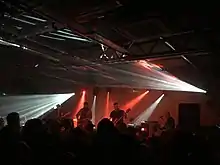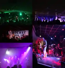 The club is split into three areas—an amphitheatre-shaped 400 capacity concert area to the left of the entrance doors, with a bar area and games room (which occasionally holds gigs) and second, 400 capacity square-shaped concert area, the Community Room, to the right.[6][20][21][2] The bar "retains the atmosphere of [a] working men's club",[6] offering "comfortable" chairs, Sky television, a pool table and dartboard.[6][22] The venue serves cask ales alongside speciality beers from around the world, and works with local companies, such as Kirkstall Brewery, to sell beer at competitive prices.[6][3][4] In March 2017 the Brudenell announced plans to build a single storey extension; including extra space for gigs and community groups to meet; and a new toilet block with disabled access.[23] This extension, named the Community Room, opened on 6 September 2017, hosting a performance from Waxahatchee.[24] An official opening took place the following day when Mogwai played a show to support the release of their ninth studio album, Every Country's Sun.[21]