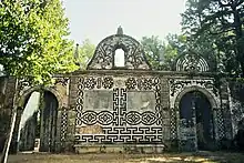 Buçaco Forest was first settled in the 6th century by friars from a nearby Benedictine monastery; five hundred years later the Bishops of Coimbra took possession of the forest and in 1628 donated it to the Order of Discalced Carmelites.[4] The Carmelite monks promptly built a convent, perimeter walls and the first of the forest's ten gates, Portas de Coimbra (Coimbra Gate).[5] Two papal bulls were issued during this period: the first, dated 1622, prohibited women from entering the forest; the second, dated 1643, threatened to excommunicate anyone found harming the trees. The text of both bulls is engraved on stone tablets affixed to the outer wall of Portas de Coimbra.[6] At the end of the 17th century small chapels representing the Stations of the Cross were built along the Via Sacra, a steep, winding path that leads from the convent to the forest's highest point, Cruz Alta.[7] The length of the path and distances between chapels were carefully measured to depict Christ's journey from the Mount of Olives to Calvary.[8]