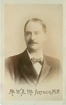 - ↑ At the General Election of 1886, McArthur was declared the victor over Sykes by a single vote, 3,742 to 3,741, and took his seat, but "on scrutiny" the seat was eventually awarded to his opponent, Sykes, by a majority of 11 votes