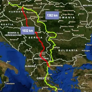 In a 2012/13 EC report, Priority Project 22: Railway axis Athens–Sofia–Budapest–Vienna–Prague–Nuremberg/Dresden (PP22),[1] the planners included their considerations of the Balkan route, which follows Pan-European Corridor X through Austria, Slovenia, Croatia, Serbia, North Macedonia and Greece (ThessalonikiSkopjeBelgradeBudapest/ZagrebLjubljanaGraz/Salzburg) and shortens the present AthensBudapest route via Bulgaria and Romania by 330 km (210 mi). The total length is around 1,030 km (640 mi) compared to 1,362 km (846 mi) for the current southern AthensBudapest part of PP22. Moreover, there were also a number of technical advantages of this proposed part of the Balkan route: 89% of it was electrified, as against 75% of the present PP22 route and the tracks were designed for higher maximum speeds overall. Nevertheless 64% of the planned line was still single track, compared to 54% of the present part of the PP22 route.