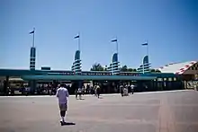 The park's main gate was extended outward to where the postcard letters formerly stood, and resembles the Pan-Pacific Auditorium, similar to the entrance of Disney's Hollywood Studios in Florida. The Red Car Trolley travels through the plaza.[7] The main gate was opened on July 15, 2011. The construction of the Red Car trolleys began on January 10, 2010. Construction of Buena Vista Street itself began in October 2010 and opened on June 15, 2012.[1] Throughout construction, the main entrance remained open with areas blocked off from time to time to aid in construction.