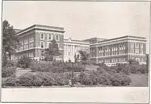 Main (east) entryway to Building 40 in the late 1930s. The Vedder and Craig Pavilions are on the right and left, respectively.