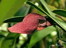 The species is slow-growing epiphyte with an ascending growth habit. Its pseudobulbs are ovoid, 1-leafed at the apex, spaced of about 2.5cm on a creeping rhizome. Leaves are oblong, dark green, 4.5~9cm long. Inflorescence is from the base of the pseudobulb and single-flowered, 14cm long. Flowers are 5cm long with a dorsal sepal with pointed apex bent forward. lateral sepals are falcate, converging at the apex. Flowers are colored with maroon macules. [1]