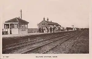 Bulford was the terminus of the public passenger service; trains which continued beyond it were exclusively for military purposes. It had a single concrete-faced platform on the down side of the line, with a run-around loop and a substantial station building built from brick and timber. At some point in later years, the building was fitted with a large wooden awning which covered the platform in front of it. The station had a small signal box, though this was reduced to a ground frame in 1935. There were sidings and a large goods yard.[3]