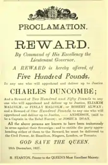 Shortly after the outbreak of the Rebellion of 1837 in Toronto, Burford Township was the centre of an abortive rebellion in the London District of Upper Canada led by Dr. Charles Duncombe. An American by birth, Duncombe made his home east of Burford Village in 1828 and by popular demand entered politics, being elected to the legislative assembly as member for Oxford County in 1830 and again in 1834. He was increasingly drawn to a leadership role for the Reform cause and by 1837 was as well known in the province as William Lyon Mackenzie. Duncombe was at his home in Burford when rumour arrived that Mackenzie had launched his Rebellion and his supporters had taken control of Toronto. "Carried away with the excitement of Mackenzie s reputed success, the people of South Dumfries, Oxford, Burford and Oakland urged Dr. Duncombe to lead a movement in support of the advance on the capital. Reluctantly, but willing to stake everything on the result of a strike for freedom, he consented, and appointed a rendezvous at the Village of Scotland"[7] with the intention of marching through Oakland township, Brantford and Hamilton to support Mackenzie. Over 300 men had gathered in Oakland before the news arrived that Mackenzie had been defeated, and on learning this, Duncombe ordered those in Oakland to disband.