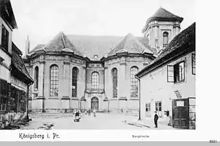The wooden vault of the nave was covered with stucco, and only the apses had a stellar vault. The pulpit was on the long side of the nave covered with a crown. The organ was the work of Johann Josua Mosengel's assistant Georg Siegmund Caspari (1693–1741), who built the instrument as his “Probstück“ (=masterpiece) under Mosengel's supervision.[1] It was, like many organs in Konigsberg, decorated with the Prussian eagle and is considered to be the last new built organ in the area of East Prussia, which was equipped with a choir organ. Commissioned by commerce official Charles Cabrit, the church's portal was designed in 1727 with allegorical sandstone figures of justice, love and, charity.