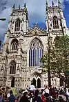 Originally buried across the street in Greyfriars, but the original tomb was lost when the friary was demolished in 1538. The remains of Richard III were recovered by an archaeological dig in 2012 and re-interred in 2015.[4]