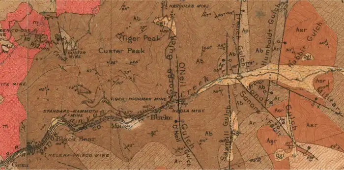 1907 Geologic map of Burke, which includes the locations of the Helena-Frisco, Standard-Mammoth, Tiger-Poorman, Hecla and Hercules mines