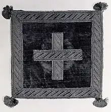 A bursa (or burse), from Greek βύρσα ("hide", "skin", "bag"), is a parament about twelve inches square[1] in which the folded corporal is kept in for reasons of reverence. It is used in the liturgy of the Roman Catholic Church and the Lutheran churches. Until the reform of the Second Vatican Council, when it fell out of use in many places, the bursa was carried by the priest to the altar when he entered for Holy Mass. It is placed upon the chalice at the beginning and end of the Mass and on the altar at benediction.