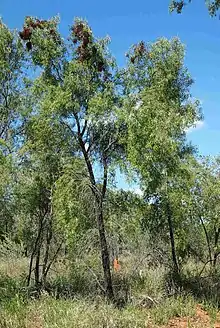 This bursaria occurs throughout most of Queensland apart from near the coast and the arid inland, and in isolated populations in the northern part of the Northern Territory. It usually grows in open, grassy woodland and open forest.[2][3][4]