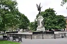 The pedestal measures 5.5 metres (18 ft) in height and 2.4 by 1.8 metres (7 ft 10 in × 5 ft 11 in) in cross section. Its top four corners contain carved representations of cherubs with winged helmets. The front and rear of the pedestal hold bronze plaques dedicating the memorial to the memory of the men who died in the First World War.[1] The sides of the pedestal feature 1.8 metres (5 ft 11 in) high bronze figures of Saint George and the goddess Peace.[3] The armour-clad Saint George stands with his foot on a vanquished dragon, a sword in his right hand and shield in his left while Peace holds a bird in her outstretched right hand.[2] Saint George is depicted in a naturalistic manner similar to how he appears in Fehr's memorials in Leeds and Colchester.[4] The memorial stands on a three-stepped stone base on top of a wider stone terrace, surrounded by a low metal chain fence.[1]