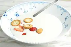 ![]() Koldskål with kammerjunker and strawberries served in a bowl | |