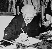 In 1945, Kaori, who was a student soldier, died in an air strike by the US military. From this experience of hers, she launched the "Kokusai Hibo no Kai" (International Society of Sad Mothers) and launched peace-proclaiming activities in various parts of Japan.[1] During and after the Second World War, Yanagiwara became more and more interested in peace activism and religion.[3][2]