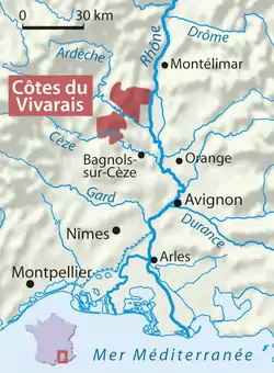 The vineyards are at an altitude of 250 metres on either side of the gorge and are located in the Ardèche communes of Bidon, Gras, Labastide-de-Virac, Lagorce, Larnas, Orgnac-l'Aven, Saint-Montan, Saint-Remèze, and Vinezac, and in the Gard communes of Barjac, Le Garn, Issirac, Montclus, and Saint-Privat-de-Champclos.[1]