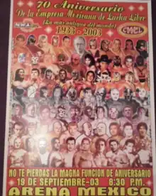 The CMLL 70th Anniversary Show (Spanish: 70. Aniversario de CMLL) was a professional wrestling major show event produced by Consejo Mundial de Lucha Libre (CMLL) that took place on September 19, 2003 in Arena Mexico, Mexico City, Mexico. The event commemorated the 70th anniversary of CMLL, the oldest professional wrestling promotion. in the world. The anniversary show is CMLL's biggest show of the year, their Super Bowl event. The CMLL Anniversary Show series is the longest-running annual professional wrestling show, starting in 1934.