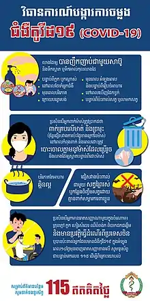 The public health response is led by the Ministry of Health with support from the U.S. Centers for Disease Control and Prevention, World Health Organization and Institut Pasteur du Cambodge.[6][7][8] Contact tracing, quarantining, screening of arrivals[9][10][11] and public messaging related to hygiene, social distancing and mask wearing[12] have been central to the containment strategy. According to Global Health Security Index's report in 2019, Cambodia ranked 89th out of 195 countries in preparedness for infectious disease outbreak.[13]