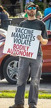 Soon after the start of the COVID-19 pandemic, preexisting anti-vaxxer social networks started online and in-person campaigns to discredit the developing COVID-19 vaccines targeting United States citizens.[7] Anti-vaccination influencers used Twitter and other social media platforms to spread vaccine misinformation.[7] Some in the medical field have given false credibility to vaccine hesitant beliefs. This caused the Federation of State Medical Boards to issue a statement in July 2021 that any physicians who generate and spread vaccine misinformation or disinformation would risk disciplinary action.[8][9]