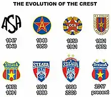 As FC Steaua appeared in 1998, the club added two yellow stars on top of the CSA Steaua badge signifying its 20 titles of champions won, along with the Fotbal Club specification.