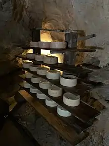 The milk is first heated and curdled by the addition of rennet. The whey is removed from the curds, which are then packed into cylindrical molds called arnios, salted and left to cure and harden. After the initial curing period of around two weeks, the Cabrales is then aged a further two to five months in natural caves in the limestone mountains of the area. The cheeses are placed on wooden shelves known as talameras, where they are periodically turned and cleaned. Relative humidity in these caves is typically 90% and the temperature is a cool 7–13 °C (45–55 °F), conditions favoring the development of penicillium molds that produce blue-green veins throughout the cheese.[1]